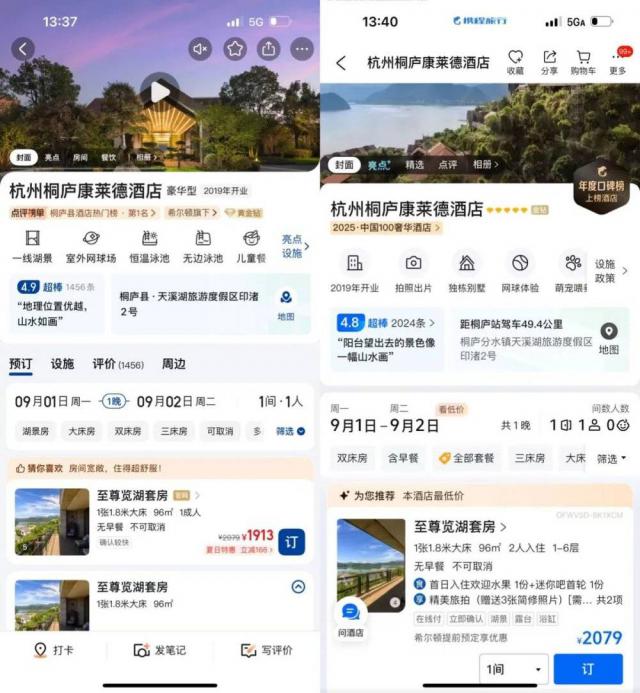 然而,携程无法决定竞争对手的补贴。美团显然还想在该领域进一步发力,在酒店方面已经开展了补贴促销。以桐庐康莱德酒店为例,9 月 1 日至尊览湖套房的间夜价格为 2079 元,而美团上,补贴后该房型价格为 1913 元。