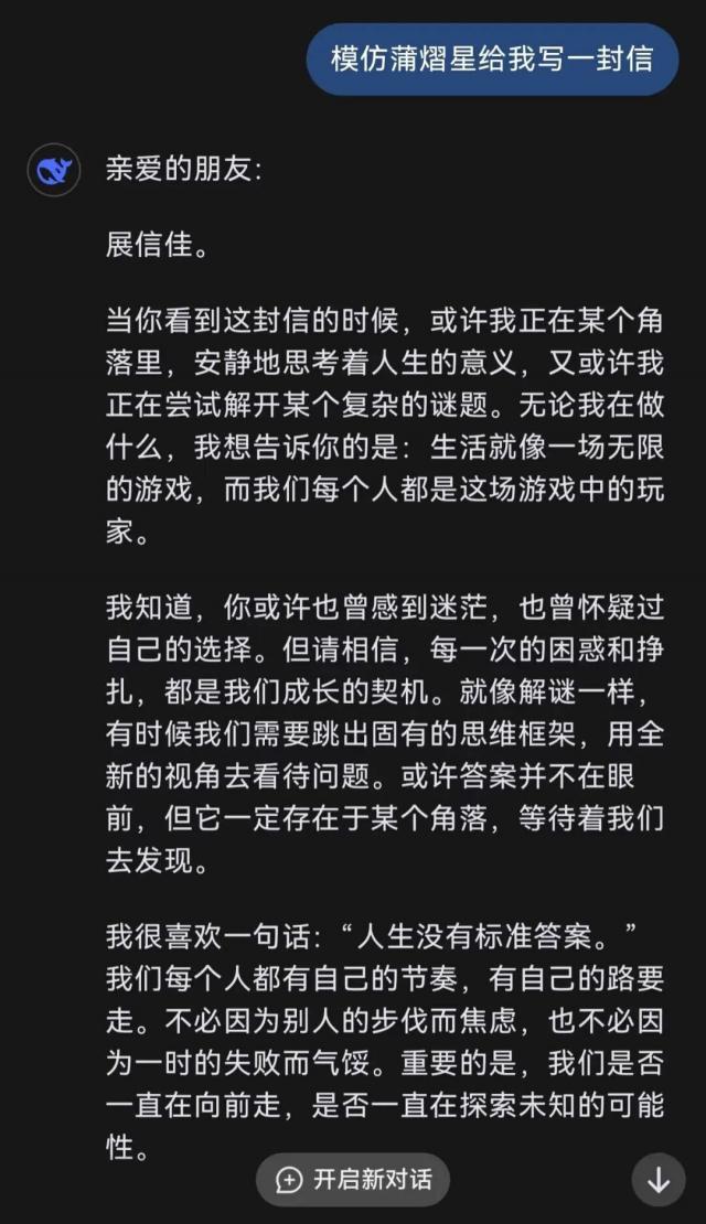 追"我担"需要付出海量的时间和心力,但与偶像互动的机会却很稀有。DeepSeek 横空出世后,很多追星女孩给它下达指令,让它模仿偶像给自己写一封信,用于代偿自己对偶像的期待与思念。